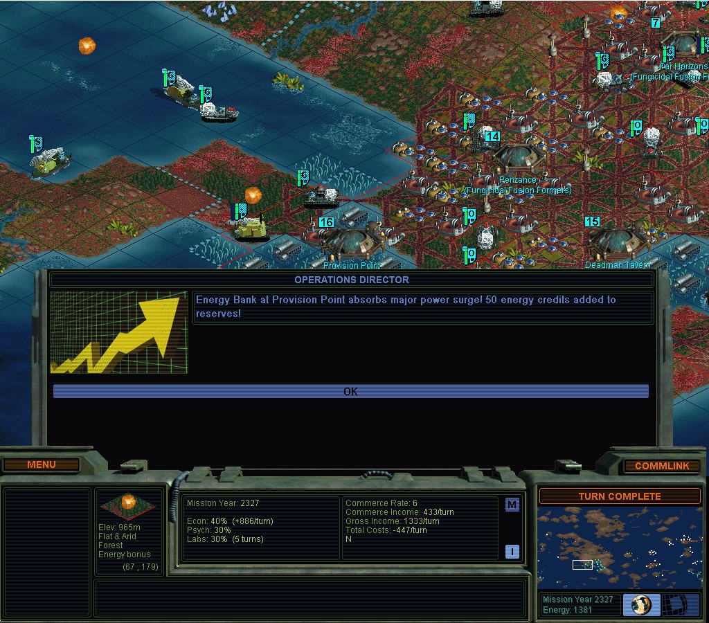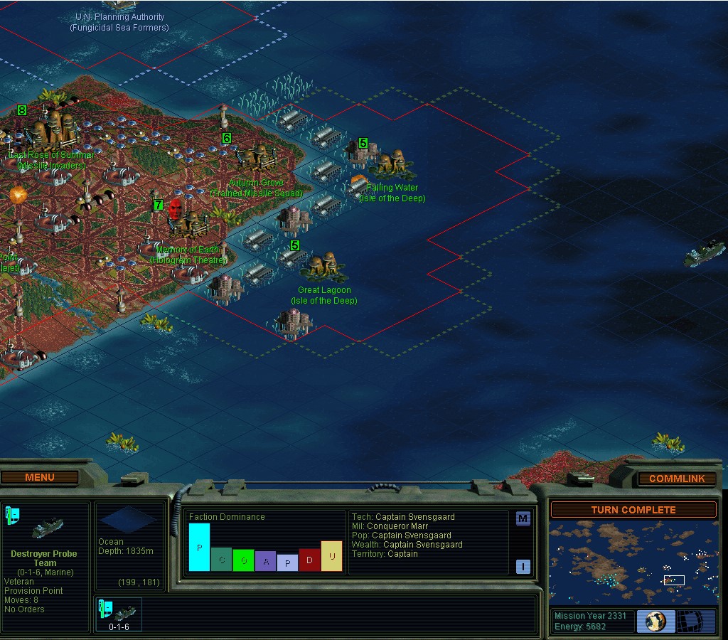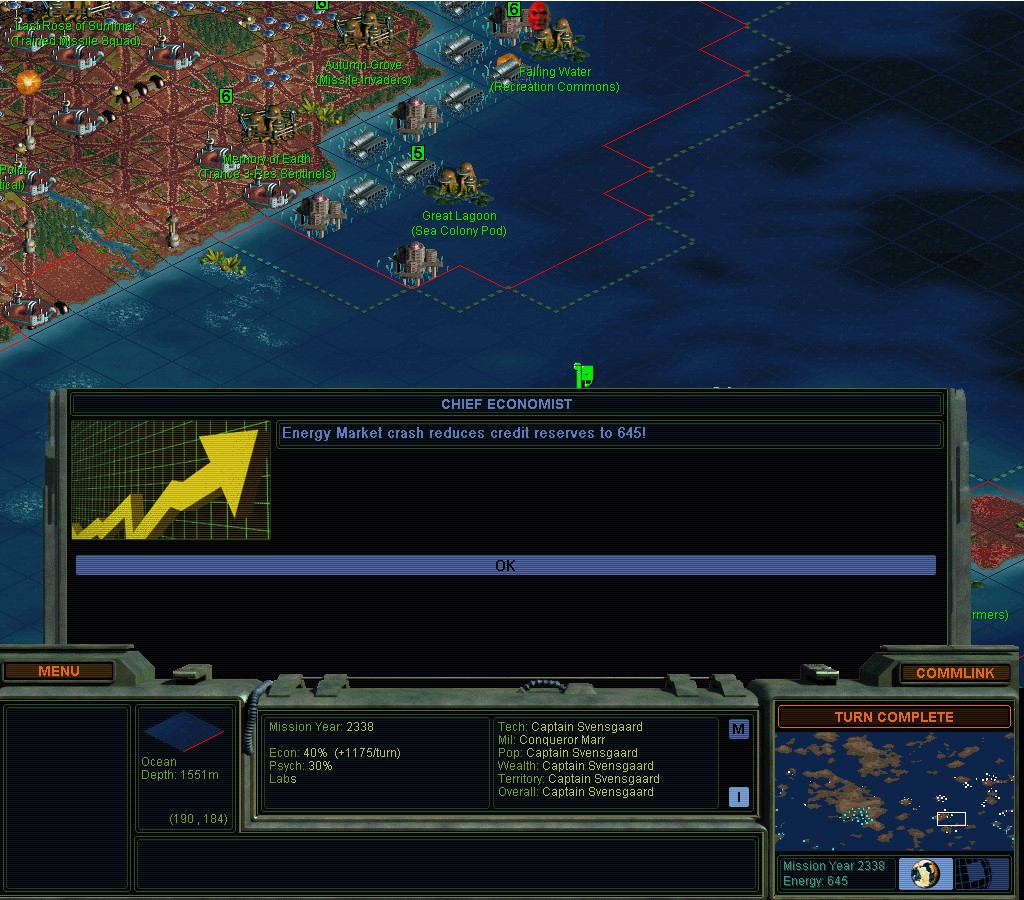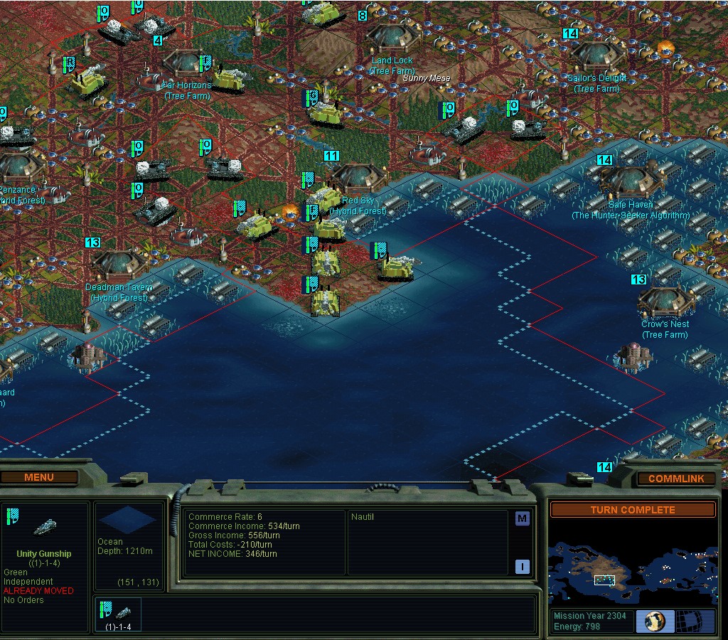 "Progress" dictates that I will continue building my Hybrid Forests, which might stop all the Global Warming and maybe nothing will sink. Still, I'm going to have to put a Pressure Dome on that base now. The Tree Farm it's building is about to complete next turn anyways