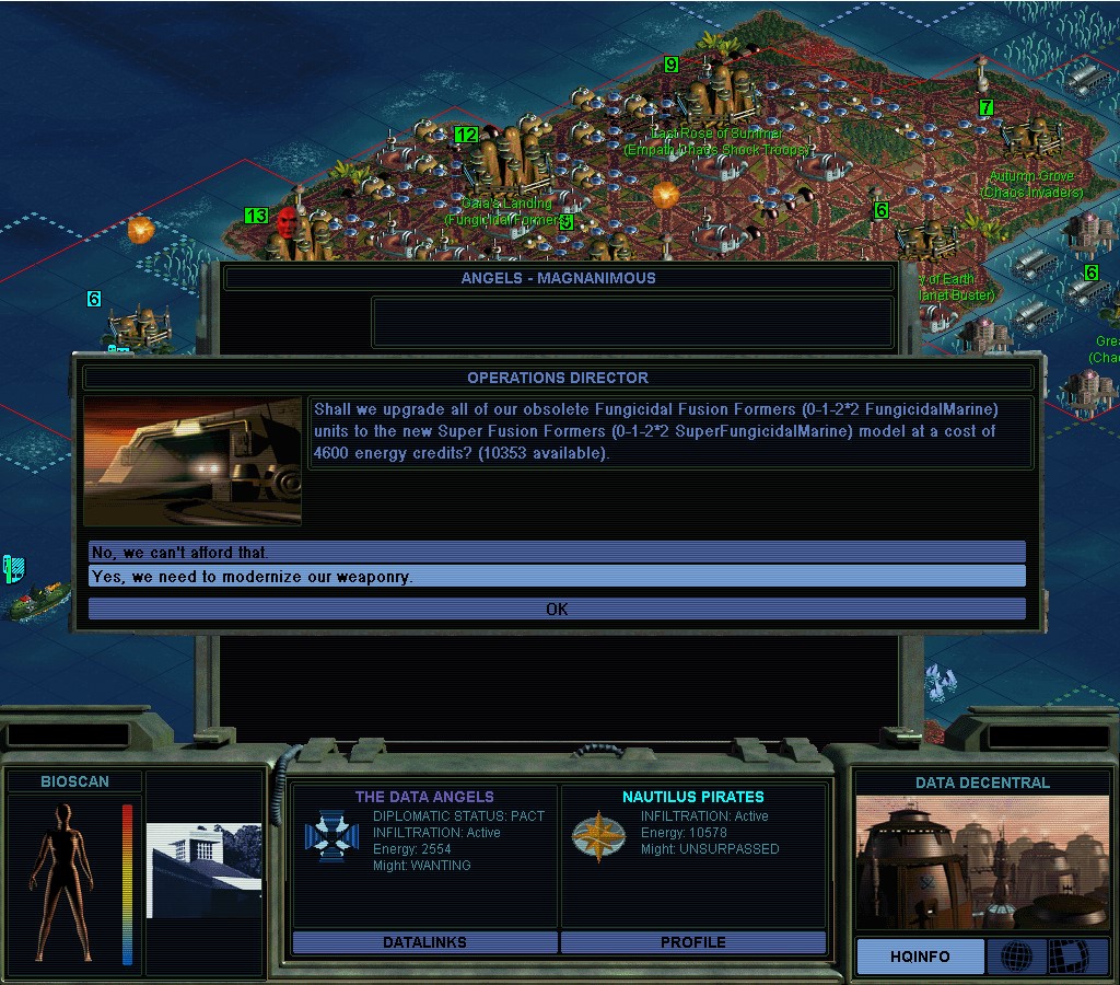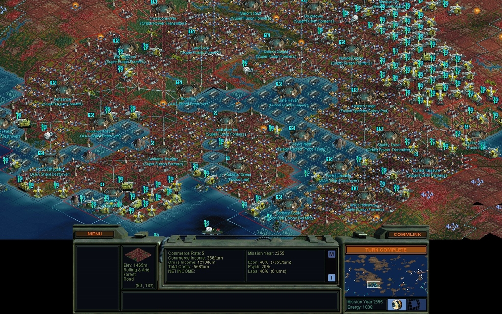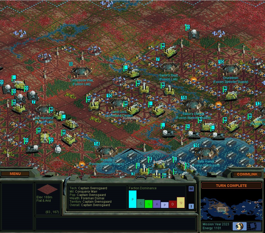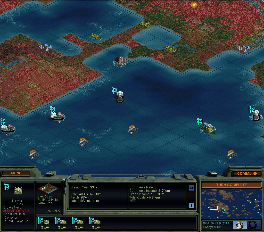 "Progress" dictates that I will continue building my Hybrid Forests, which might stop all the Global Warming and maybe nothing will sink. Still, I'm going to have to put a Pressure Dome on that base now. The Tree Farm it's building is about to complete next turn anyways