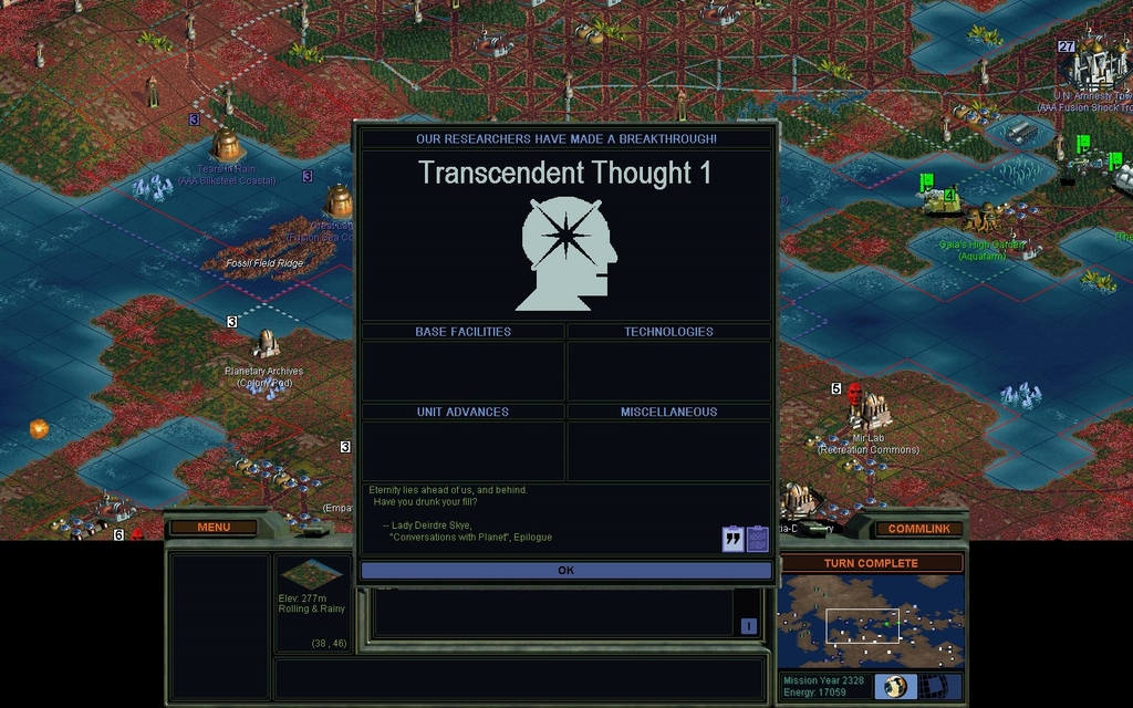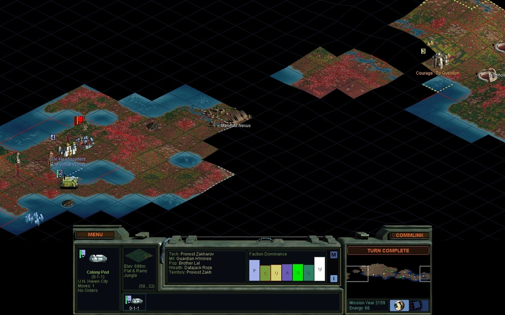 My sister Mylochka's experience playing SMACX was I set her up with a copy -I legit own three paid-for ones- and a custom deliberately-super-OP faction I made a long time ago as training wheels for SMACX newbs while they learn the game, The SupahNewbs faction to be found in Downloads, and she won her very first game and had a ball - if she was much of a gamer and had stuck with it, I'd have pressured her to switch to playing Gaians before she got bored. Sometimes an easy game is all I want...