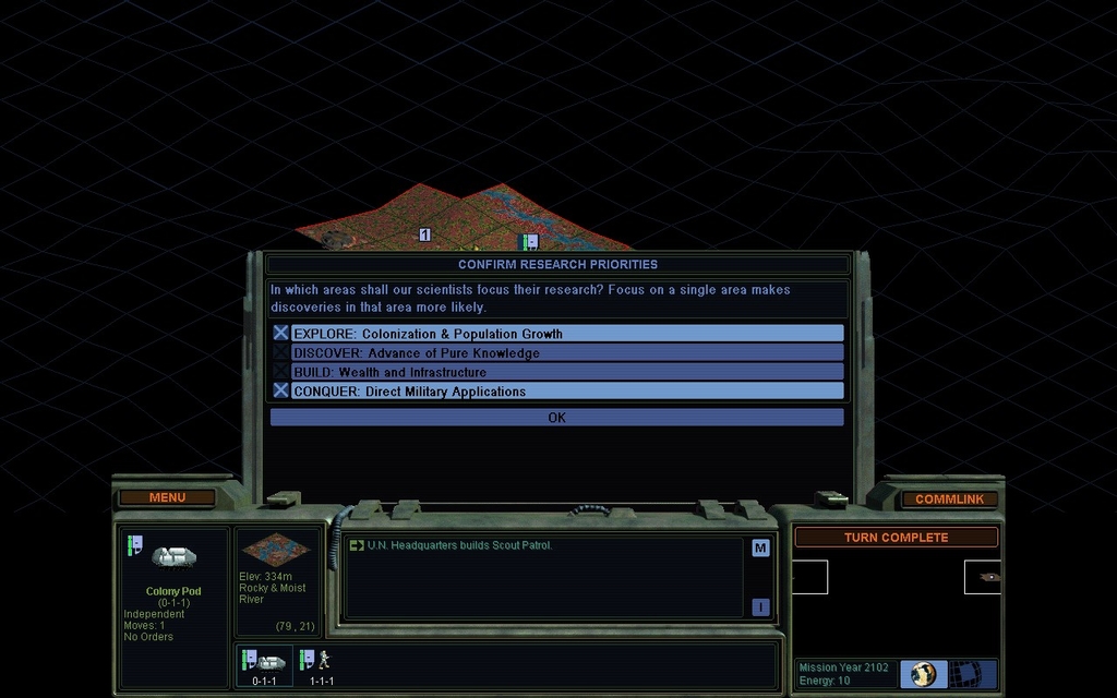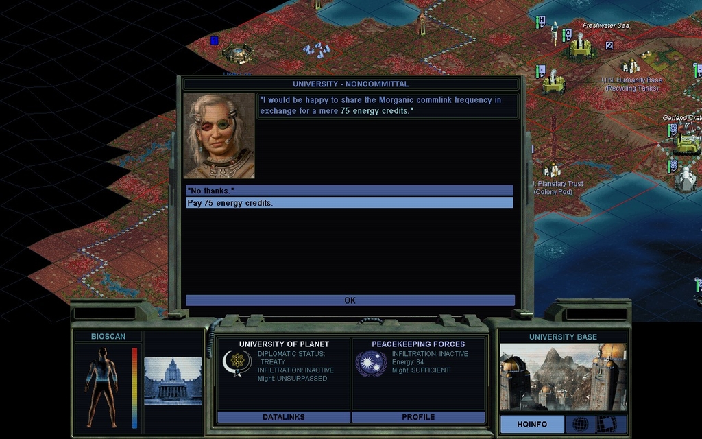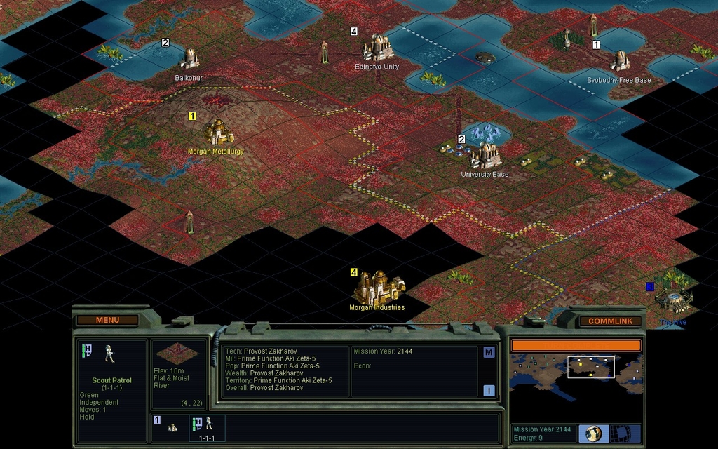 MY 2144.  The Consciousness meets the University, and I gain their comm frequency from my ally.  Before I can use it, I run into a University scout myself.  We sign a Treaty.  He gouges me for Morgan's comm frequency.