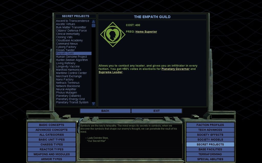 The Empath Guild comes late in my mod, and is also deemed a Conquer tech.  In my view, Diplomatic Victory is just an abbreviated form of conquest.  Homo Superior is a Tier 6 tech that also makes Thought Control available.  That's a long time away, late midgame at the earliest.  I am guaranteed 2x votes over anyone else for at least half the game, so all I have to do is make sure I get big.
