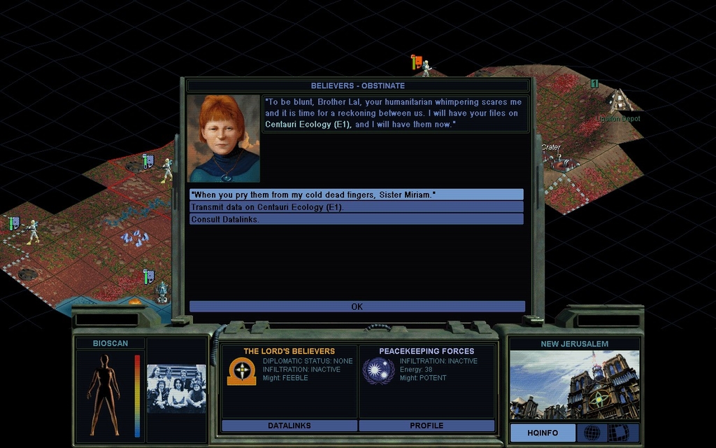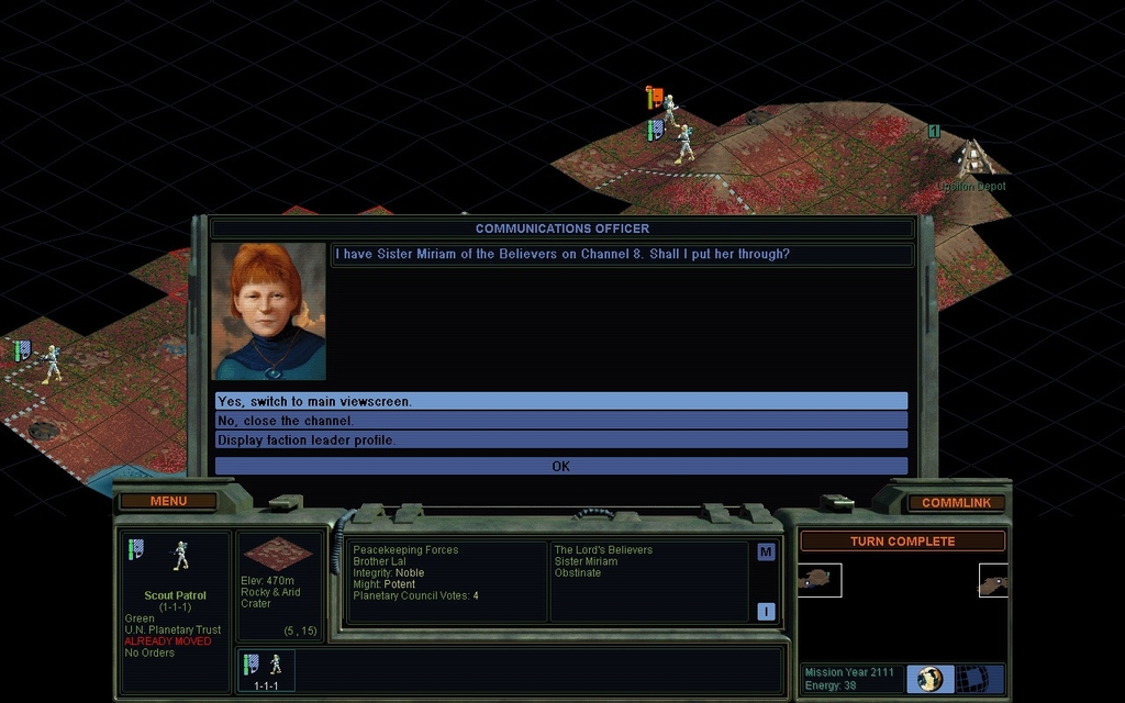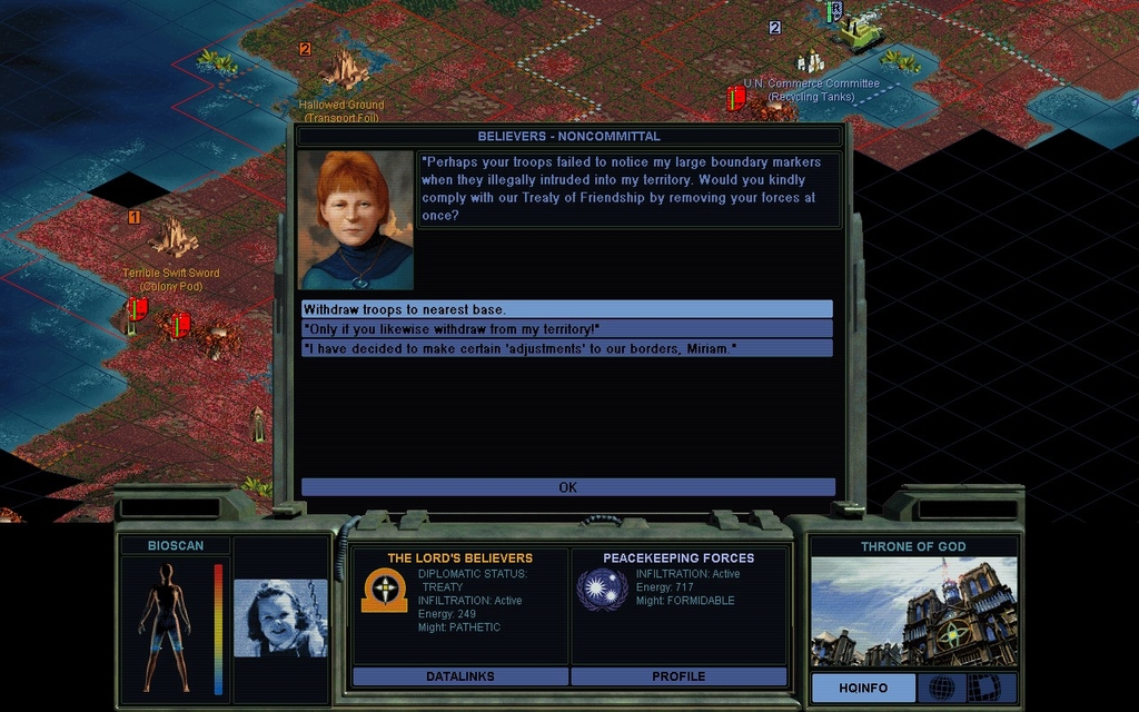 Definitely a much better neighbor than the Believers.  She won't ally or trade techs though.  She's probably ahead of me, with her +1 RESEARCH bonus.  She didn't claim to know any other comm frequencies either.