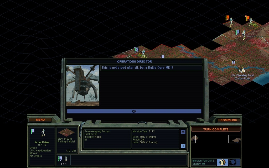 MY 2118.  Strangely, Miriam did not move this Colony Pod out of the way.  I wonder if another enemy is nearby, exerting a zone of control?  If she thinks this will stall me from getting to her base, it's not a good move.  The Battle Ogre is coming, although maybe she hasn't cheated enough to know that.  Anyways with the new 100% Noncombat penalty, it's going to be trivial to execute these colonists.  I've got such a large force, let's see if she'll actually surrender to me!