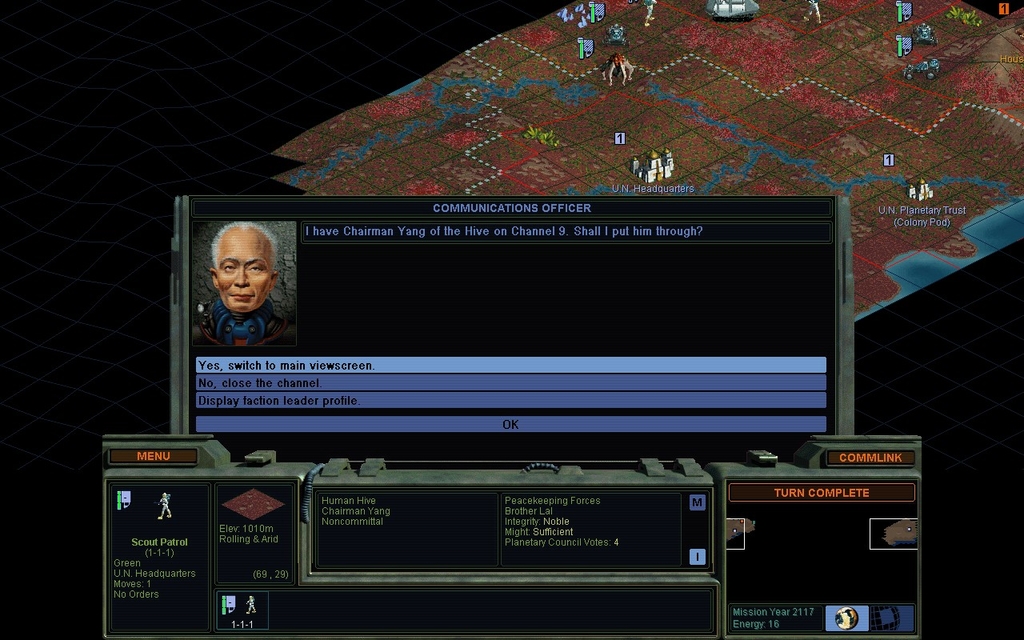 The Cyborgs had the wreck of the USS Unity near their territory.  Her map info tells me where some of the other factions are.  I'm surprised to see a clump of them so near me to the west.  Was Yang cheeky, or have I just been preoccupied and presumptive?  Time to go pester him about it.  Uuuh, he doesn't wanna talk.  Typical!  Well I could send a probe team eventually.