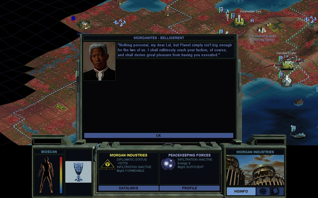 MY 2257.  Recently I noticed that Cha Dawn had gone back to war with Morgan again.  I was thinking about how convenient it would be to just take him over, the problem being, Morgan never actually asks for my help.  Well now Cha Dawn has solved the problem for me!  I'm not certain this was a rational decision, although in my mod he's fixated on Fundamentalist politics and might hate my Democratic ways.  Maybe he attacked one of Morgan's bases that I have garrison units in?  Yep, just after I captured that screenshot, I got an illustration of him attacking Morgan Metagenics.  My Battle Ogre MK2 was the strongest defender, thereby giving me the excuse I need to wipe out the Cultists.  So I guess it had a purpose after all.