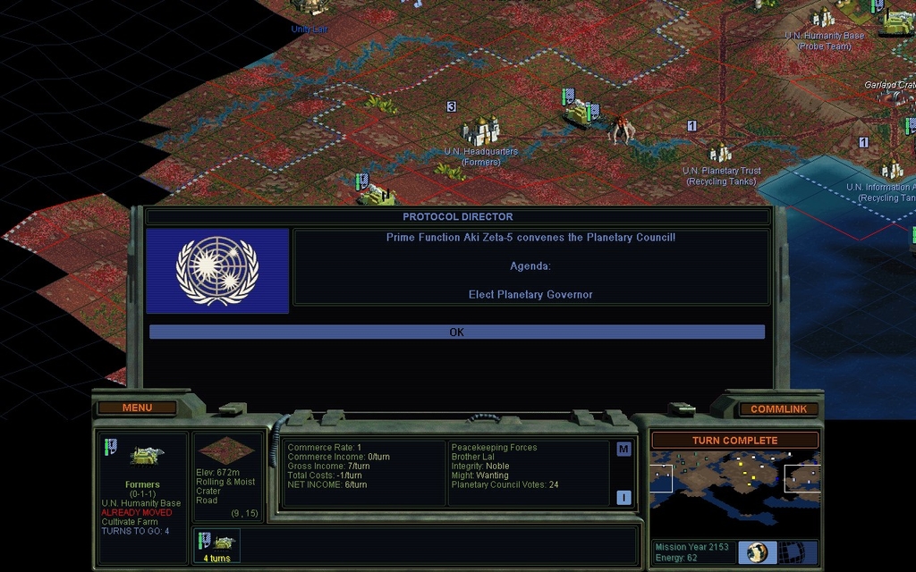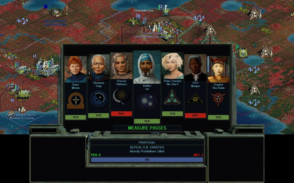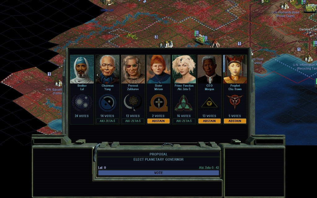 Now to see what Miriam wants to do.  I am only a few votes shy of Supreme Leader.  Those "wet rock" terraforming tactics are actually directly helpful to my cause now.  Zhakarov's population hasn't changed much; he's not into growth the way I am.