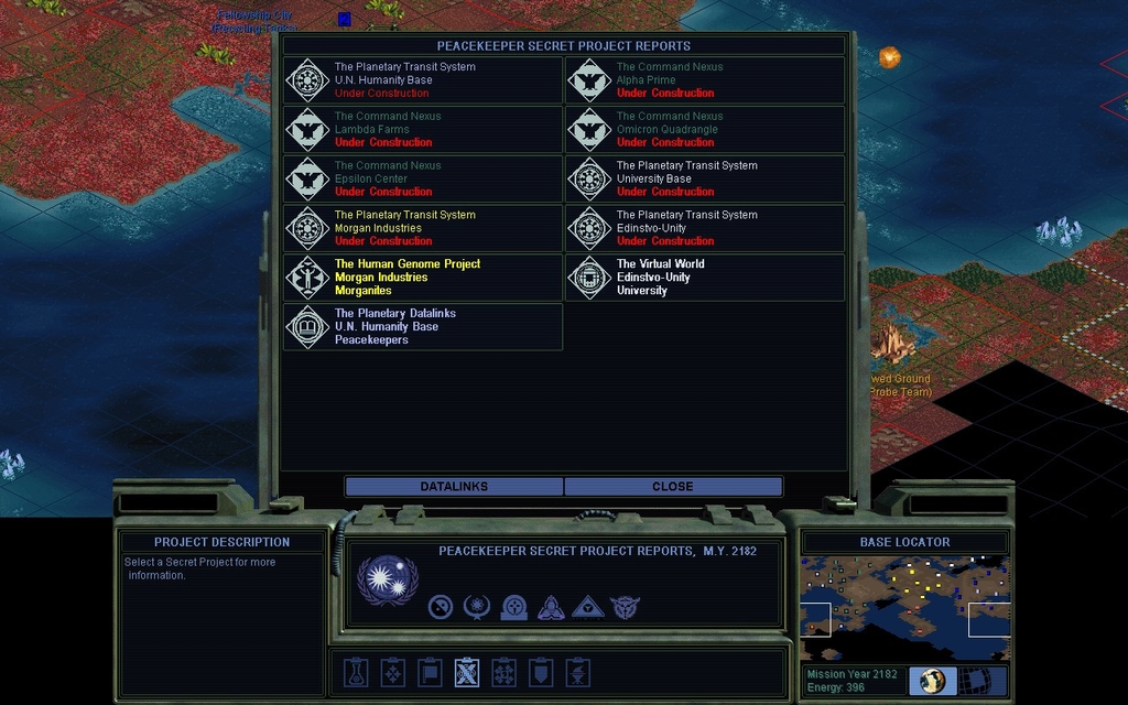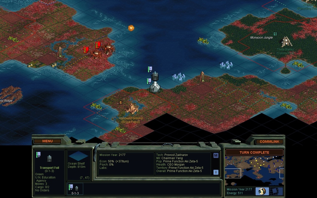 MY 2128.  This will give me helpful intel on my neighbors.  Worth noting: in my mod, Foil Probe Teams are available as a predefined unit.  The AI makes heavy use of them!  Sea bases are extremely vulnerable to subversion early in the game.  That isn't much fun unless you leave one out as "bait" for a distant faction, so that you can counter-infiltrate and steal a tech.  I will send out a Foil Probe Team to search for factions.