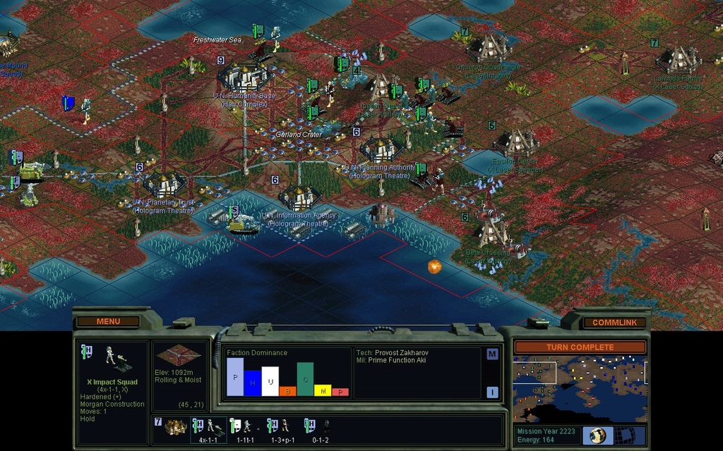 MY 2262.  Zhakarov isn't sharing techs, but he did give me a Hovertank unit.  With that I can make a lot of troublesome unit designs.  Hovertanks are not that exotic in my mod, they are a Tier 4 tech.  I might have researched them myself by now, except I didn't.  A most obviously beneficial unit would be a Hovertank Probe Team, as I can hit the Monsoon Jungle more quickly with more plagues.  Hovertank Formers are also useful.