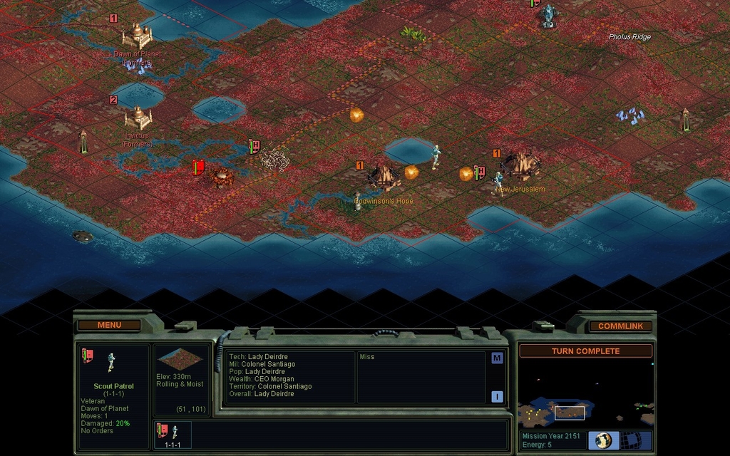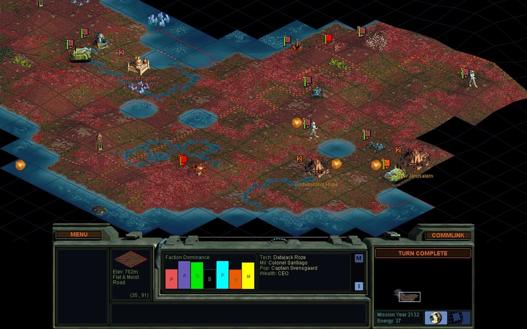 The Gaians contact me out of the blue and want Miriam's comm frequency.  At first I think I'll play dumb.  But then I think, the Believers cannot possibly do anything about me taking them over.  The terrain alone says they're completely dead.  I have their only 2 cities surrounded, and I killed a new colony pod last turn.  So I sell the frequency.  I don't get anything else out of the Gaians, but their demeanor changes from Quarrelsome to Obstinate.