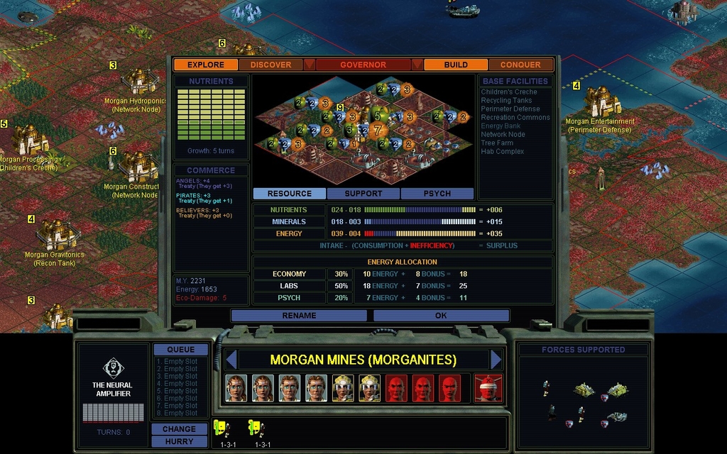 Aside from the 3 cities I took from Morgan, most of my cities are only size 4.  When they get to be size 5 they become unhappy and I make a colony pod.  I'm still trying to settle my original island while all this crazy spam war is going on.  I'm at an order of magnitude less capability than various factions.  I hope they have an order of magnitude less intelligence than I do.