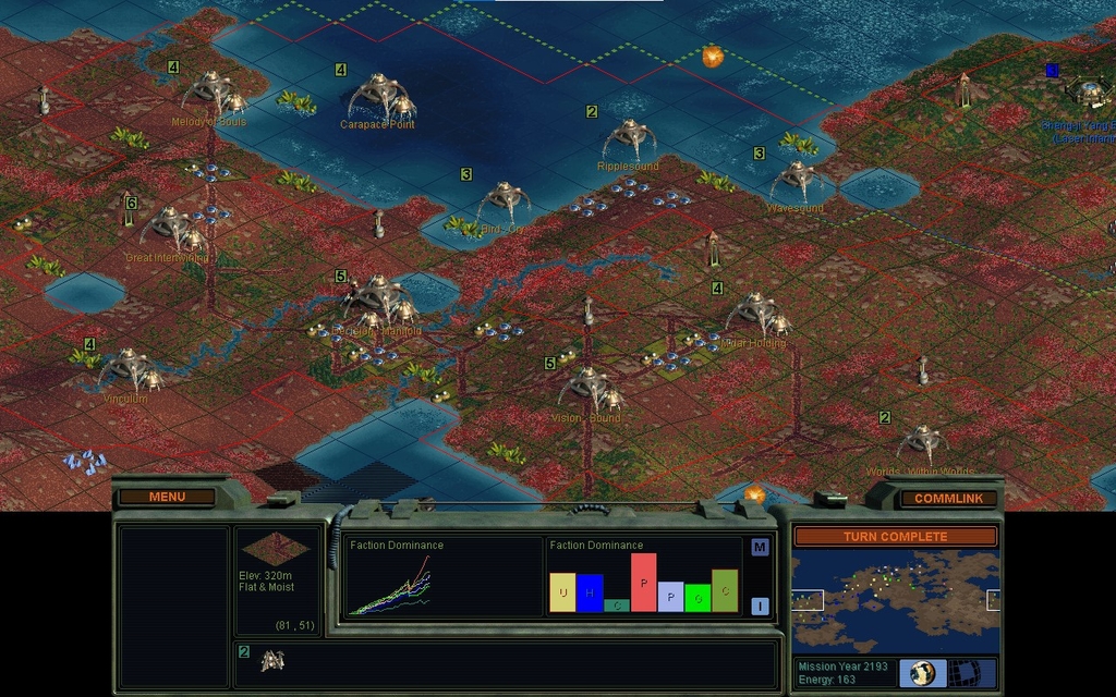 I wasn't expecting all these larvae everywhere, like north of Marr's Dissolution.  I bet it was stirred up by Deirdre.  Putting a base next to a patch of fungus is generally not a good plan, but neither is wandering around a lot when you're on a big land mass.  You're going to have neighbors, and they stand an excellent chance of being hostile.  As far as neighborliness goes, I had no idea how right I was.  Now a larva this early shouldn't be a cause for alarm, as I am in a base and my unit is Disciplined rather than Green.  But if it did kill by base, I'd be pissed.  To be honest I'd save scum that.