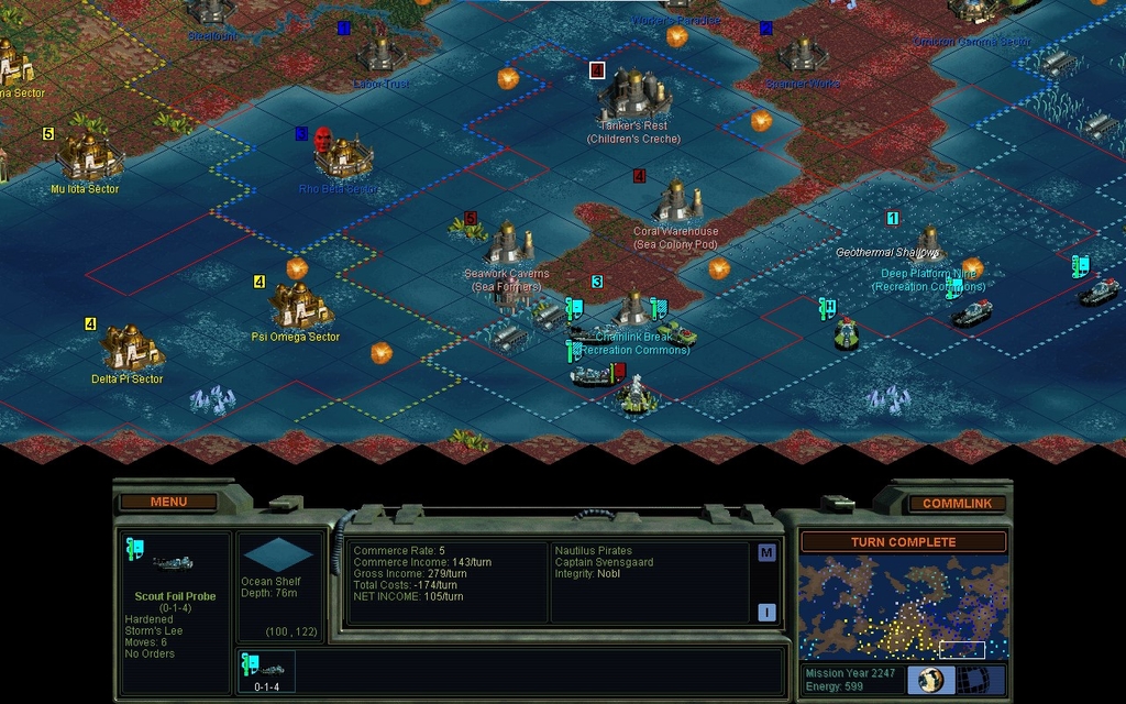 He's got a probe team on defense in this trivial forward city that I expected to be nearly empty. And an Impact Speeder to kill my probe team if I back off. I guess he was just in a war with Morgan, and of course they just made peace. I keep underestimating Lal, despite that he's been a complete jerk in every game I've seen him in. Does he especially have it in for the Pirates for some reason, or is he always this way to everyone? Why isn't being Democratic making him happy?