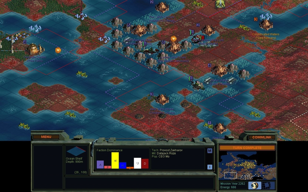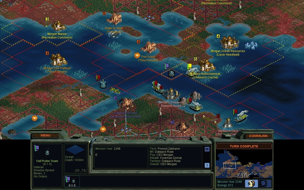 The Free Drones had me go to war with the University, but they're nowhere near me.  I don't even have a sea route to them.  I suppose I could send Hovertank Probe Teams over land through Free Drone territory.  Without a rail, it's a bit of a hike.  I've been far more concerned with getting the Believers to surrender, so that I don't have that thorn in my underbelly.
