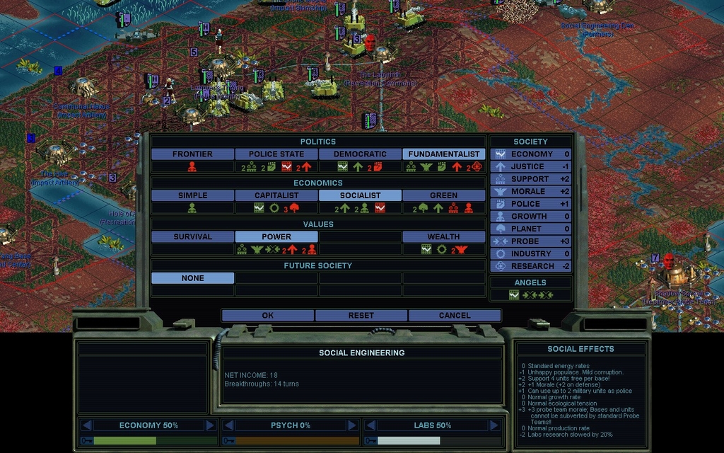 I can choose Power now, which in my mod gives +1 PROBE among other things.  That would bring me to +3 PROBE, making me immune to mind control.  Worth doing.  But it also costs -2 GROWTH and -2 JUSTICE in my mod, so I don't feel good about doing this and staying Green.  I'm switching to Socialist to offset this.  I'll just accept that my mindworms won't be quite as tough.  Not like I'm going Capitalist.