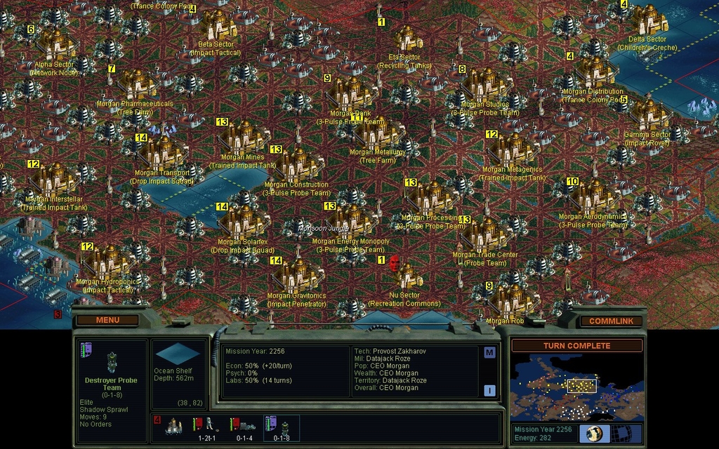 MY 2256.  Oddly enough, I've actually achieved technical parity with the Morganites, even though I am Fundamentalist.  I think the fact that they're pursuing Wealth and not Knowledge has something to do with it.  Still, with cities that big, you'd think they'd be farther ahead on research.  My allies the Free Drones also have Build techs that the Morganites do not have yet, such as Industrial Automation.  So here we see the pinnacle of a non-Borehole civilization, sitting on the Monsoon Jungle.  Maybe fighting Cha Dawn has kept Morgan busy?  As well as the Free Drones.
