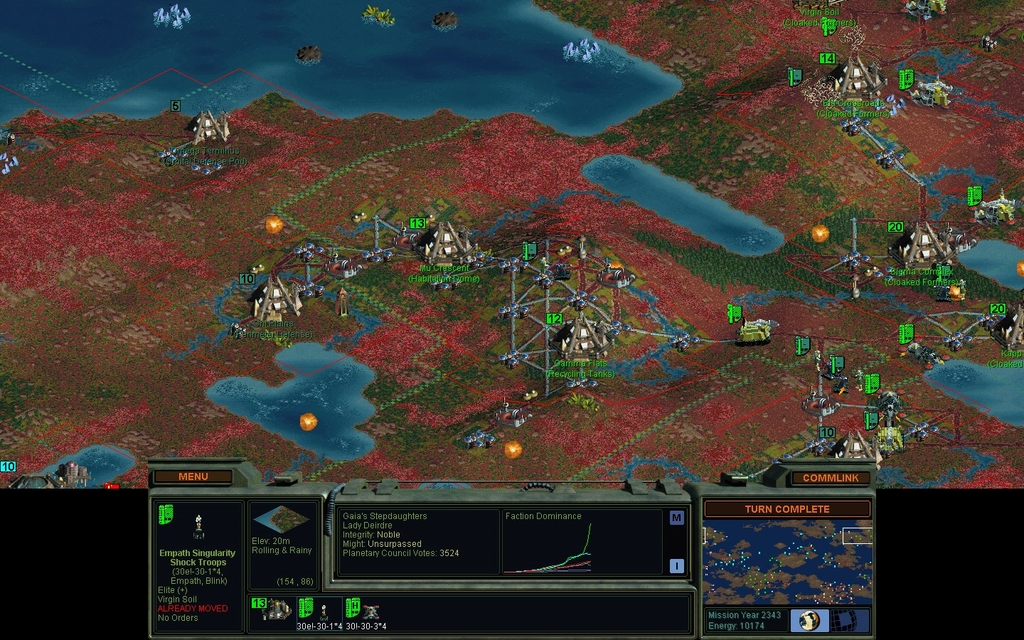 The entire planet is sinking.  I am thinking the idea of reaching a stable system was a pipe dream, unless it's all underwater.  Or unless I've conquered everybody first.  I get fungal pops every turn and now they've become gigantic stacks of Locusts.  I haven't built any air units to deal with something so massive, so I might experience casualties next year.  I'm shifting production to Drop R-Bolt Rotors to fight back.  I definitely don't need more land or marine units, it will take ships to finish off the last of my enemies.