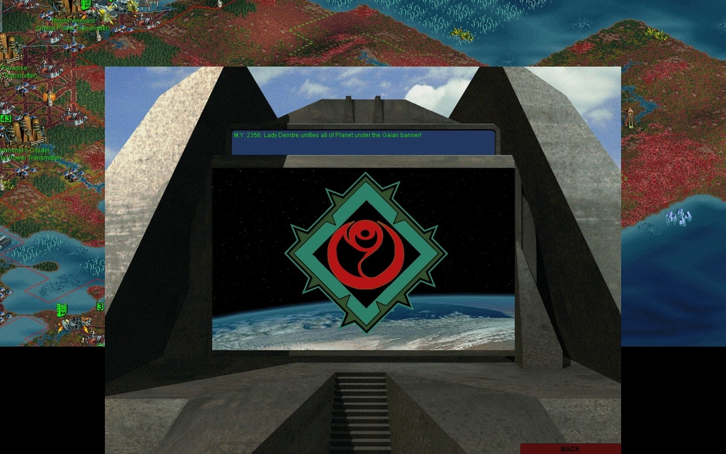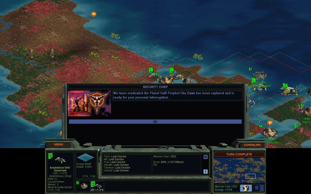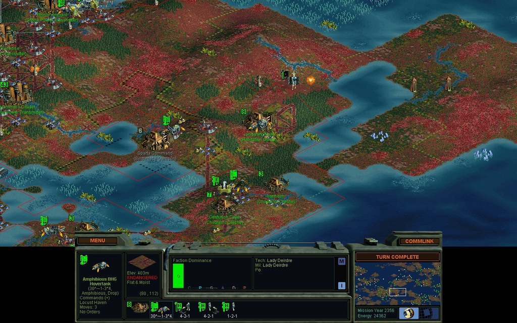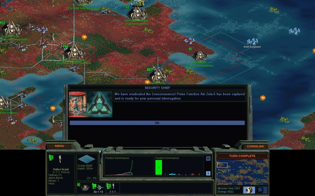 MY 2355.  Having redeployed what probe teams I could find, I take 3 Spartan cities by Total Thought Control.  The 4th eludes me because a screen of troops is in the way.  I take 1 of the troops in preparation for next turn.