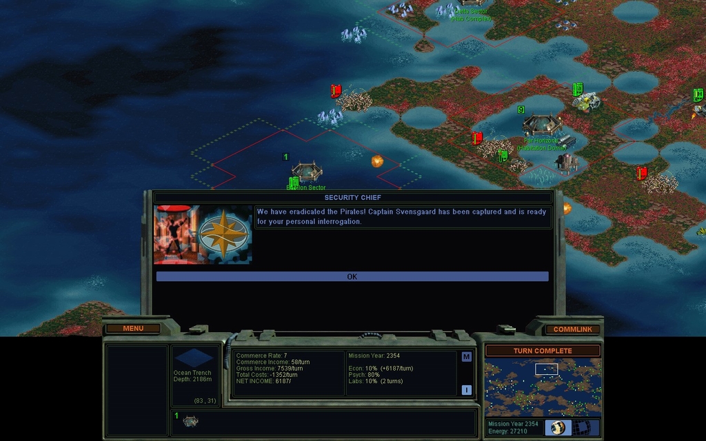 MY 2343.  Since I'm morally opposed to Transcending, I decided the fastest way to win the game (turn-wise) is to manually buy everything.  I probably have the credits / turn to do it.  If I don't, then I can just make as many Orbital Power Transmitters as needed.  I'll know I need OPTs when I run out of money buying cities.  I've ended Drop Former production, switching all of those cities to Drop Hovertank Probe Marines.  They're very effective against Pirate sea bases touching land.