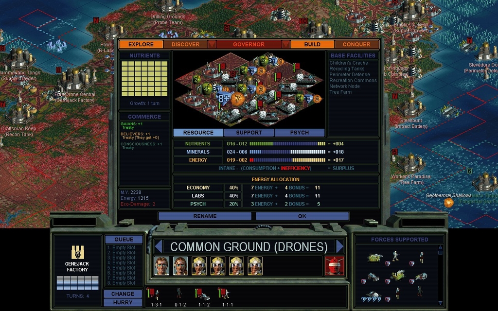 And I haven't built a single Borehole yet, despite Thinker mod's goading.  Heck I often don't even get around to building Mines anymore.  I find that the fungus becomes edible, somewhat mineral laden, and energy rich.  I build Genejack Factories nowadays, but I really don't build Robotic Assembly Plants or any more advanced factory.  I find the eco-damage penalties are prohibitive for a human player.  So I just don't do it.  I hand terraform every single square of my empire, and I do not like having a global flooding ruining all my work.
