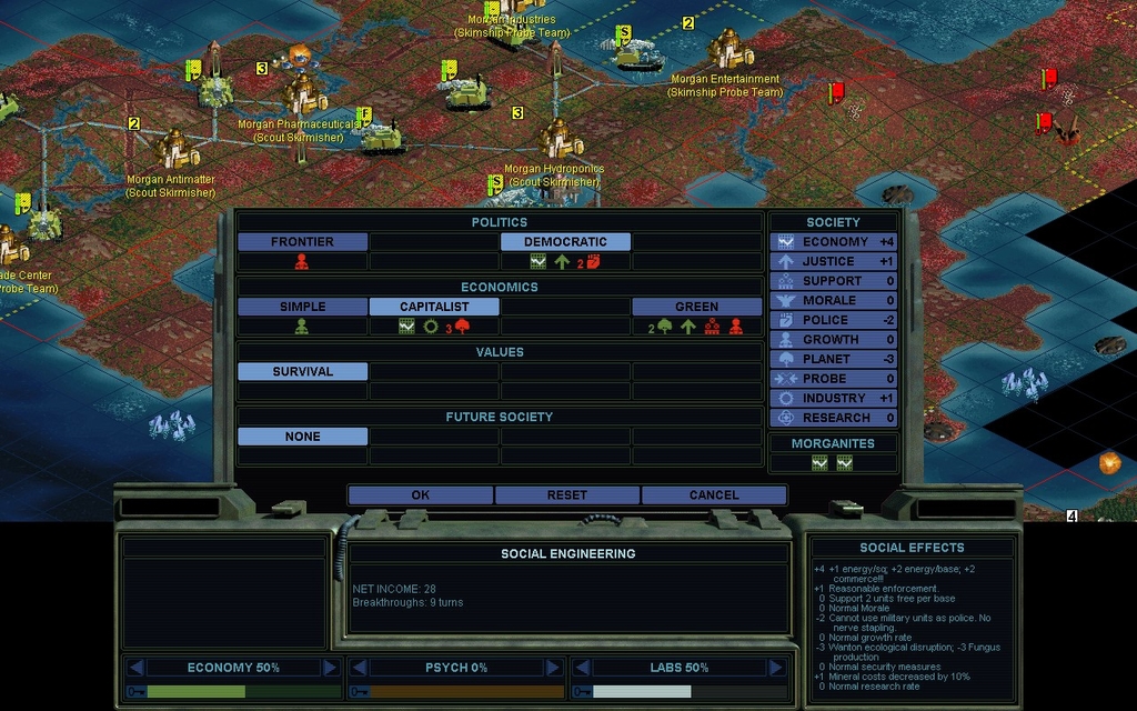 MY 2156.  I have 8 cities and have built 8 Recreation Commons.  I switch to Democratic to make more money.  I have a complete rail network connecting all my cities.  I have 4 inland bases with Command Centers that are putting out Synthmetal Skirmishers.  I've also made a few 1-1-1 probe teams for defense.  My coastal cities are putting out Foil probe teams to infiltrate other factions.