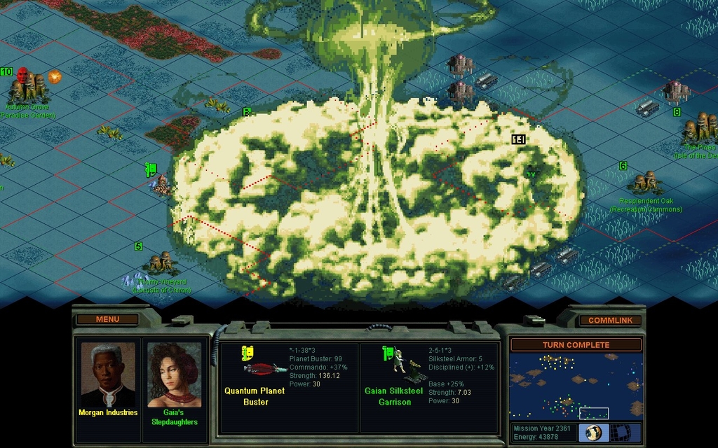 I fight 2 more rounds of Gaian units.  Then my own Formers are finally revealed.  Maybe that's the end of it.  I saved the game.  I hope this long game doesn't go belly up and become unplayable.  If it does, apologies in advance.  At any rate, obviously I've won and it's only a matter of time.  I finish the year with 25k credits.