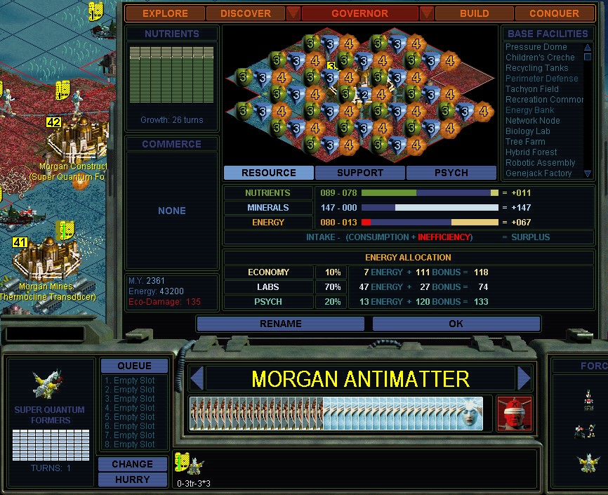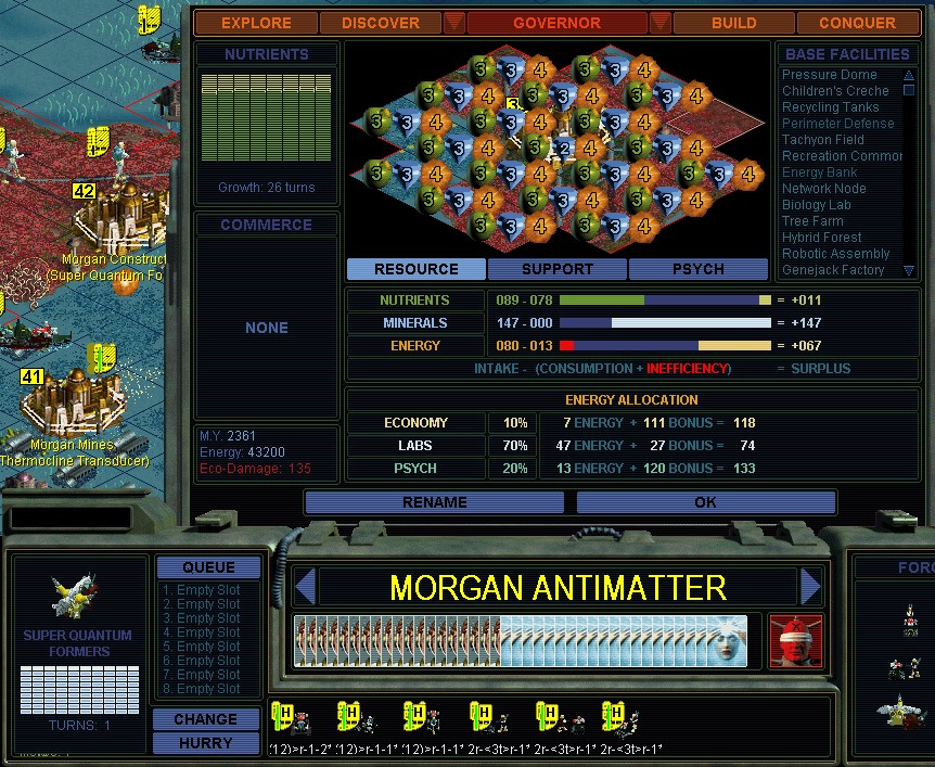Disappointed that only 1 person has had any comment on anything I've written.  That's not exactly encouragement to keep going, or to believe that there's an audience for the vast amount of work that a writeup like this takes.  Supply and demand, eh?  I definitely have other things I could be doing with Life.  Even if SMAC oriented, I'd sooner play and write up a new game with lessons learned, or try to tweak the AI's play yet again.