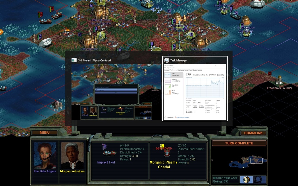 Nevertheless, I don't believe I've got any excessive CPU usage on my laptops.  There's certainly nothing I've noticed as a player of SMAC.  Then again I've got my systems on passive cooling, so maybe I wouldn't notice.  I suppose I could look at what my CPU usage is... but I'm a bit wondering about how that would be done, since changing context to view the CPU usage, changes what's running at the time.