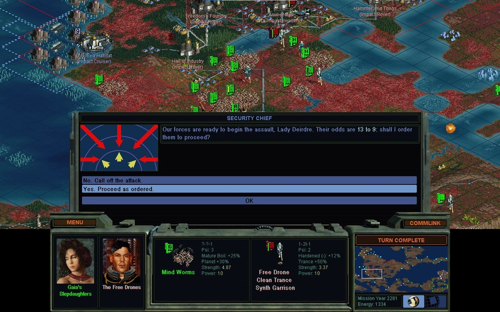 For the upcoming 1.52 release of my SMACX AI Growth mod, I've been trying to give the AI a viable defense against my typical mindworm and mag tube rampage.  I'm utterly failing.  Even with "more" Hypnotic Trance units, and going back to the original game condition where a lot of times the ability costs 0, I just crush everything in sight.  The Mission Year is 2275 and I played as Theocratic, my version of Fundamentalist, so my tech research was somewhat slowed down.  The prolific Free Drones dominated a big chunk of the map with the Monsoon Jungle, and they even got Doctrine: Air Power, but it doesn't help them.  Minor atrocities are legalized, but I've only had a few 2x Recon Rovers.  Most of my atrocities have been base obliterations after conquest.