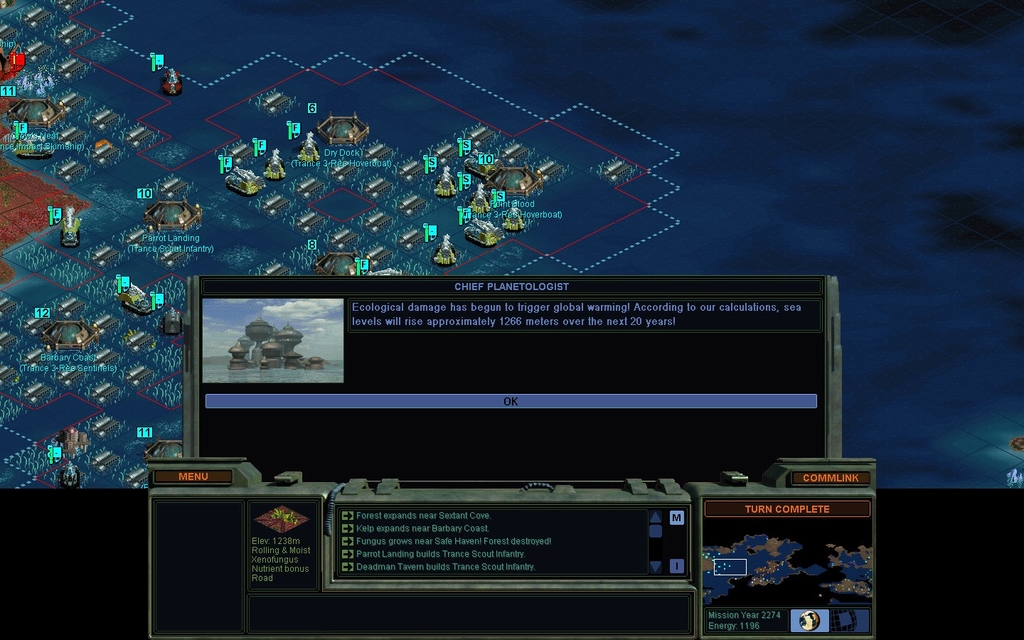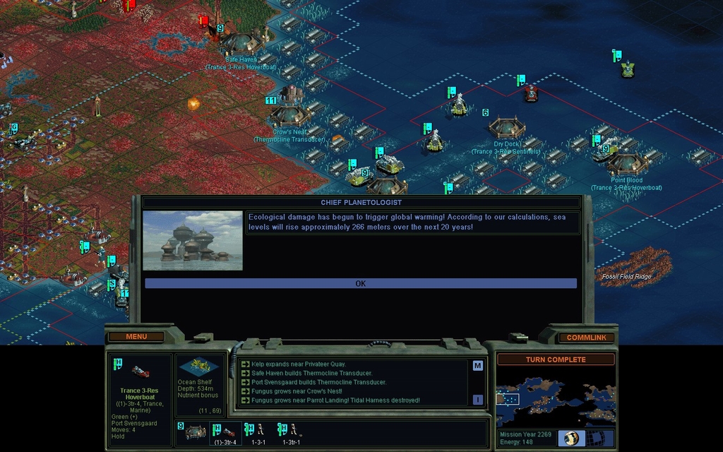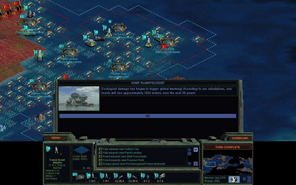 1 land and 1 sea city are badly beaten up and poorly garrisoned, with a big onslaught coming for the land base in 2 turns.  None of my city improvements have been destroyed yet though.  I have a large Sea Former fleet, and for survival I'm putting them on top of fungal sea squares, or putting them inside cities as extra defenders.  Problem is I can't even see who's attacking me if they're coming through fungus.