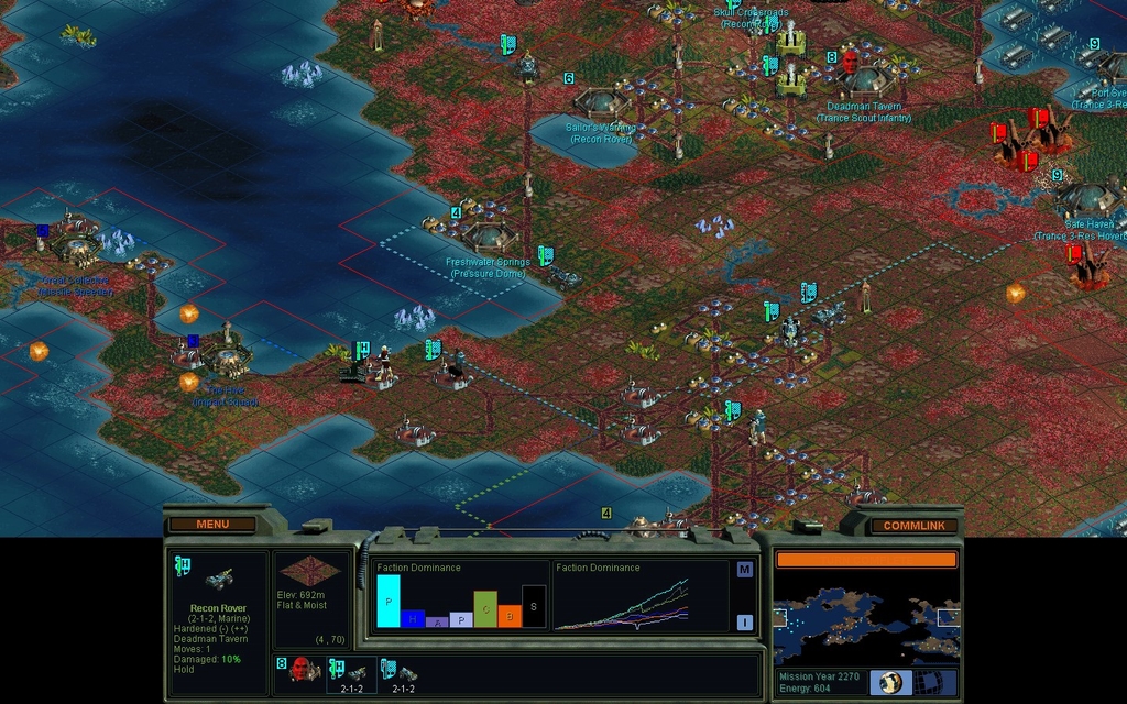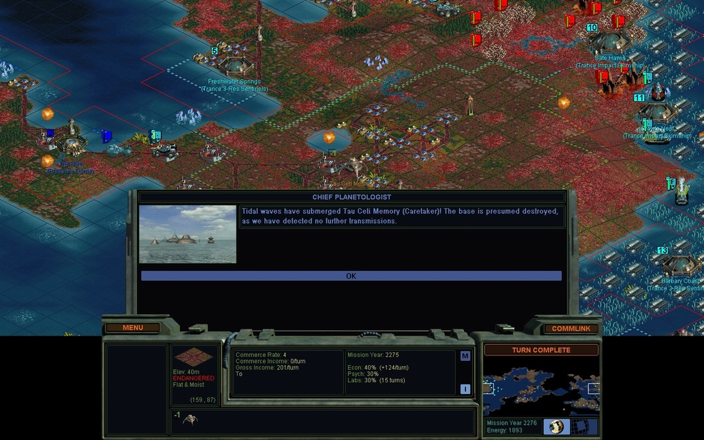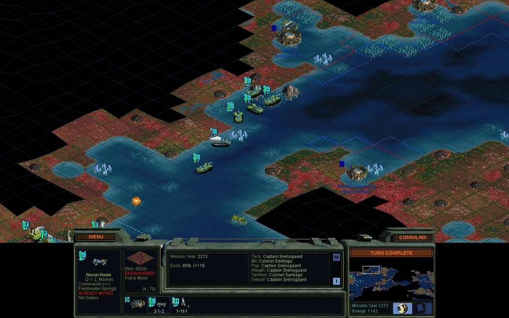 That's the last of my X units.  I won't be building any more until I feel safe from the mindworms, and right now that's like, not.  Santiago has researched Doctrine:Air Power, so I will try to sneak Skimship Probe Teams all the way to her.  Long journey.