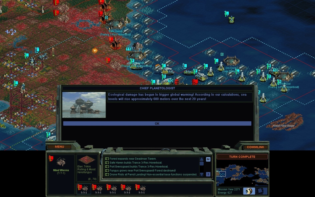 Soon, at least 1 of my land bases is going to need a Pressure Dome.  I can't really afford to lose them as they have Secret Projects in them.  I've got some serious mindworm spam bearing down on my cities, with those damn fungal paths they've created straight to my door.  I think they could win by strangling me with fungal pops alone, if this never abates.  How am I supposed to produce defensive units and counterattack units and remove fungus quick enough to make progress?  Well maybe the game's idea is I don't / I won't.  We'll see.  I've got 7 mindworms inbound on 1 city and I can't do anything about it.  Fortunately it doesn't have a Secret Project in it.