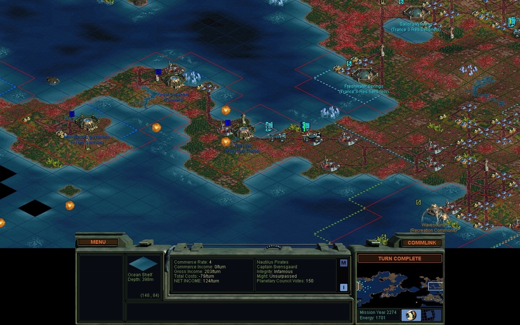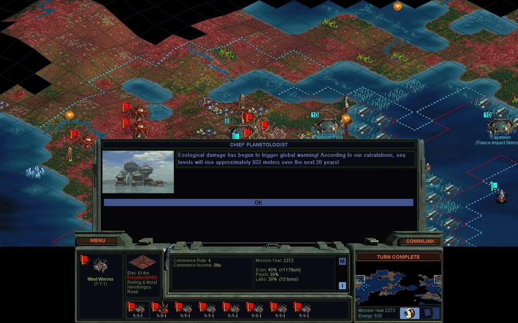 I've had enough.  1 of my Secret Project bases only has 1 defender left, and a lot more mindworms than that coming for it next turn.  This turn I got hit by lots of air attacks, leaving 2 sea bases empty and with damage to city improvements.  I just don't have the productivity to keep up with this level of spam.  In a later era of the game, I could possibly survive all of this, but I'm not seeing it now.  I could have spent more money to get more troops done faster, that's the main thing I could have done differently.  This isn't basically fun or profitable though.  Santiago, for instance, has managed to become as powerful as myself.