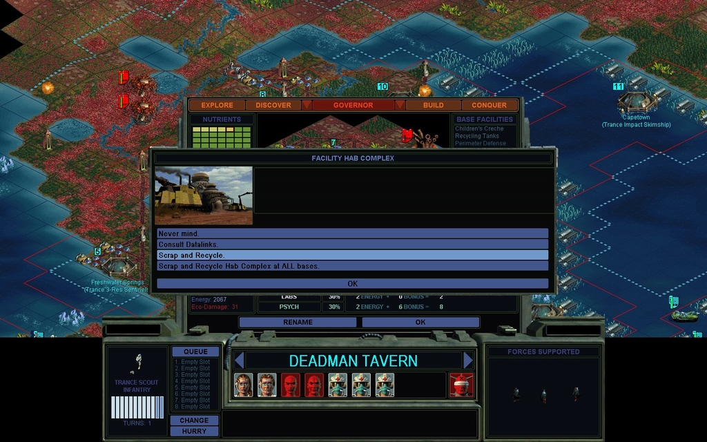 I can't hold the land base.  It has been receiving all the fungal pops of 2 coastal sea bases, because the mindworms popped on land.  It's time to sell.  I hope the other 3 bases do better, as all of them have Secret Projects in them.  I think if those get destroyed, I will quit.