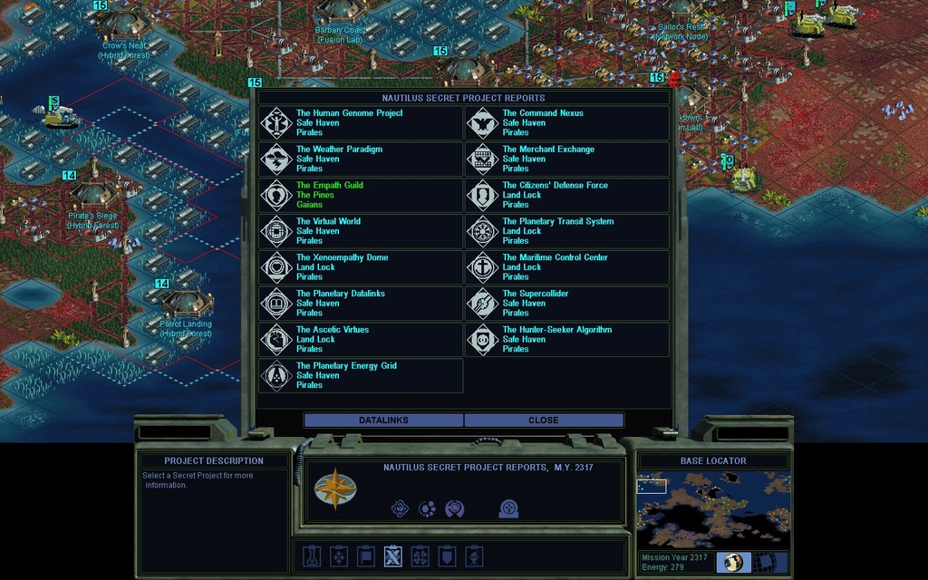 I played on an Enormous map, this time with pods enabled, and consequently had a much easier time staying ahead of other factions.  However it still takes forever to get to Fusion Power.  I only got it fairly recently and it's MY 2317.  I've spent all day on this game pretty much.  It's midnight as I write this up, and I'm quitting.  Problem is, I've developed all this nice beautiful land, all sorts of hand tilled earth.  I do not want to flood it.  Also there's a serious problem playing on an Enormous map, my enemies are out of range.  I suppose I could put X Marines on ships if I got Neural Grafting, a remaining prereq for the onslaught that I still haven't obtained.  That's even more waiting.  This basically isn't a good decision path through the game.