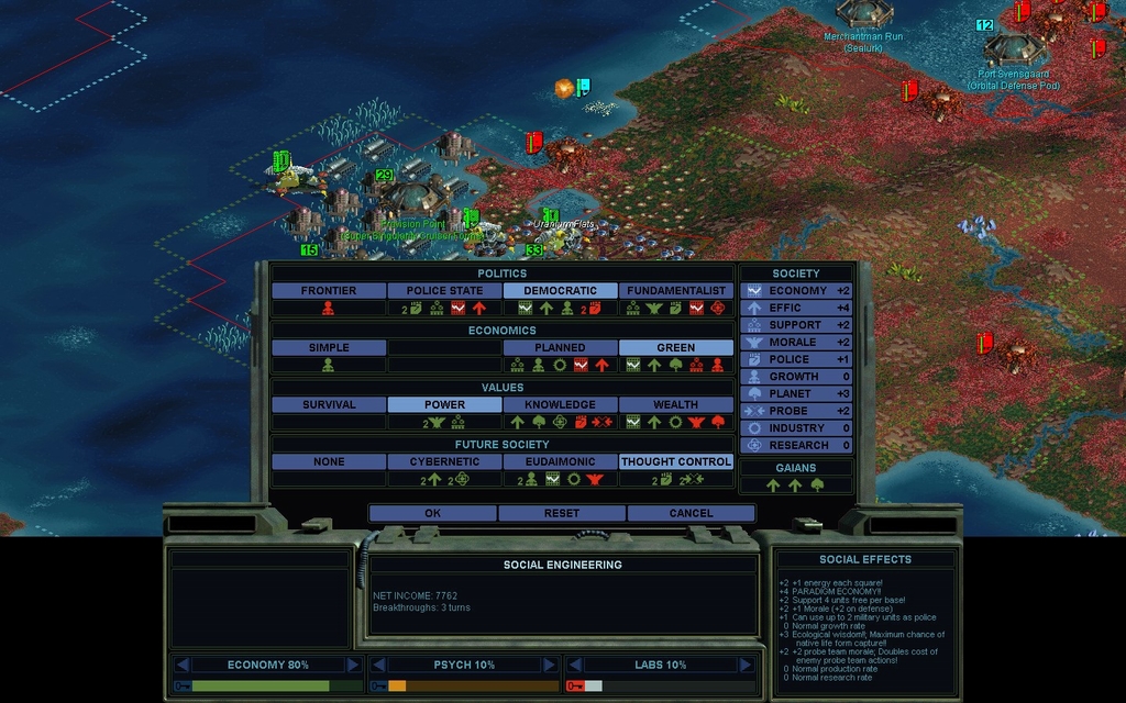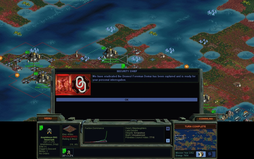 MY 2343.  Since I'm morally opposed to Transcending, I decided the fastest way to win the game (turn-wise) is to manually buy everything.  I probably have the credits / turn to do it.  If I don't, then I can just make as many Orbital Power Transmitters as needed.  I'll know I need OPTs when I run out of money buying cities.  I've ended Drop Former production, switching all of those cities to Drop Hovertank Probe Marines.  They're very effective against Pirate sea bases touching land.