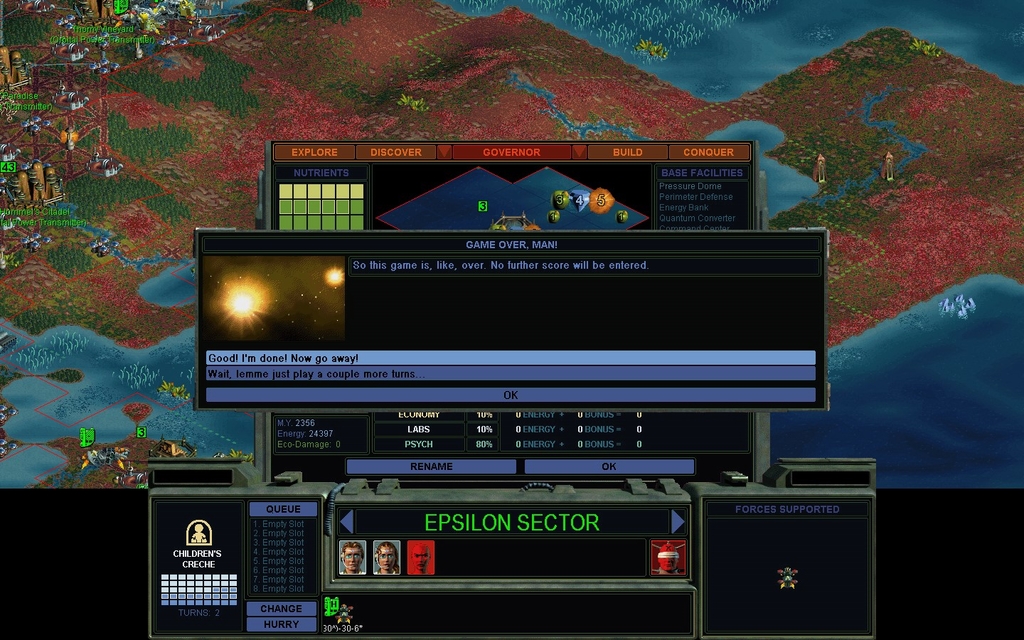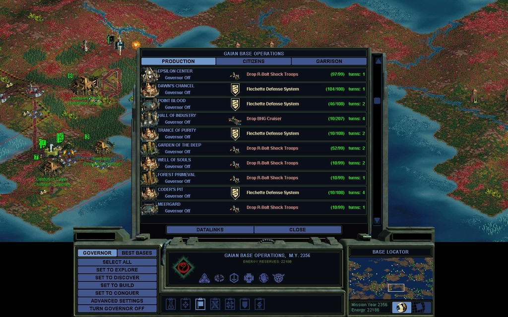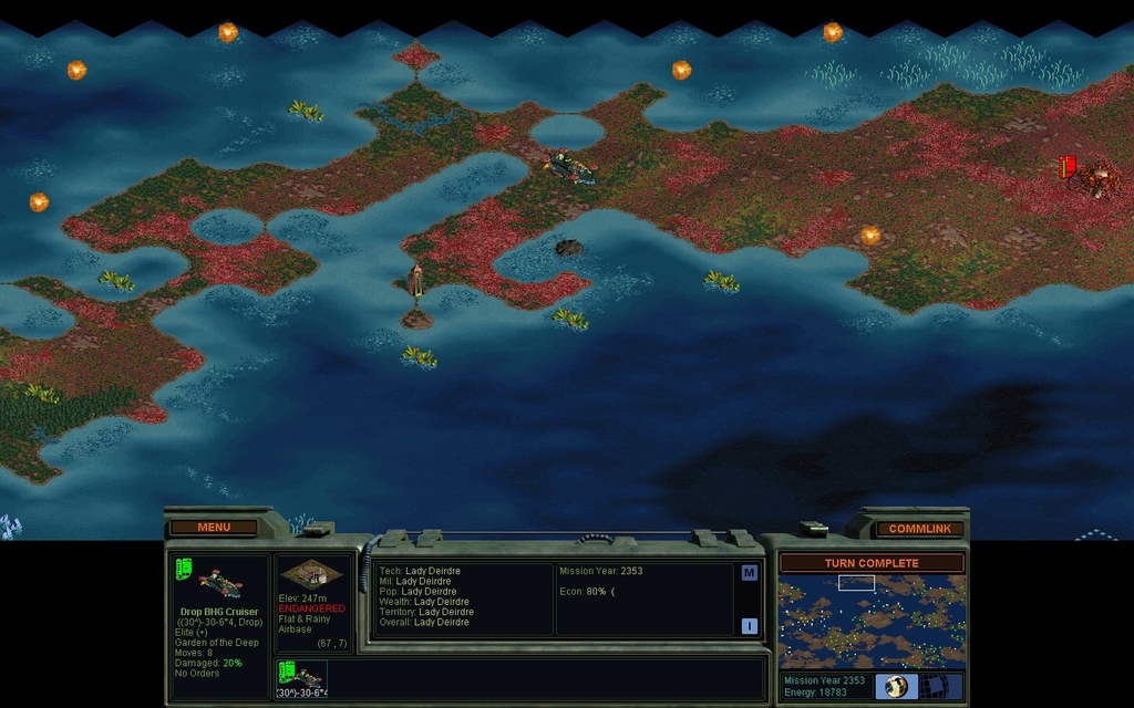 The entire planet is sinking.  I am thinking the idea of reaching a stable system was a pipe dream, unless it's all underwater.  Or unless I've conquered everybody first.  I get fungal pops every turn and now they've become gigantic stacks of Locusts.  I haven't built any air units to deal with something so massive, so I might experience casualties next year.  I'm shifting production to Drop R-Bolt Rotors to fight back.  I definitely don't need more land or marine units, it will take ships to finish off the last of my enemies.