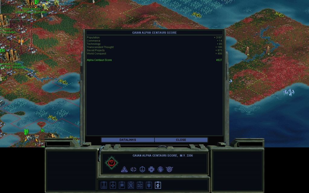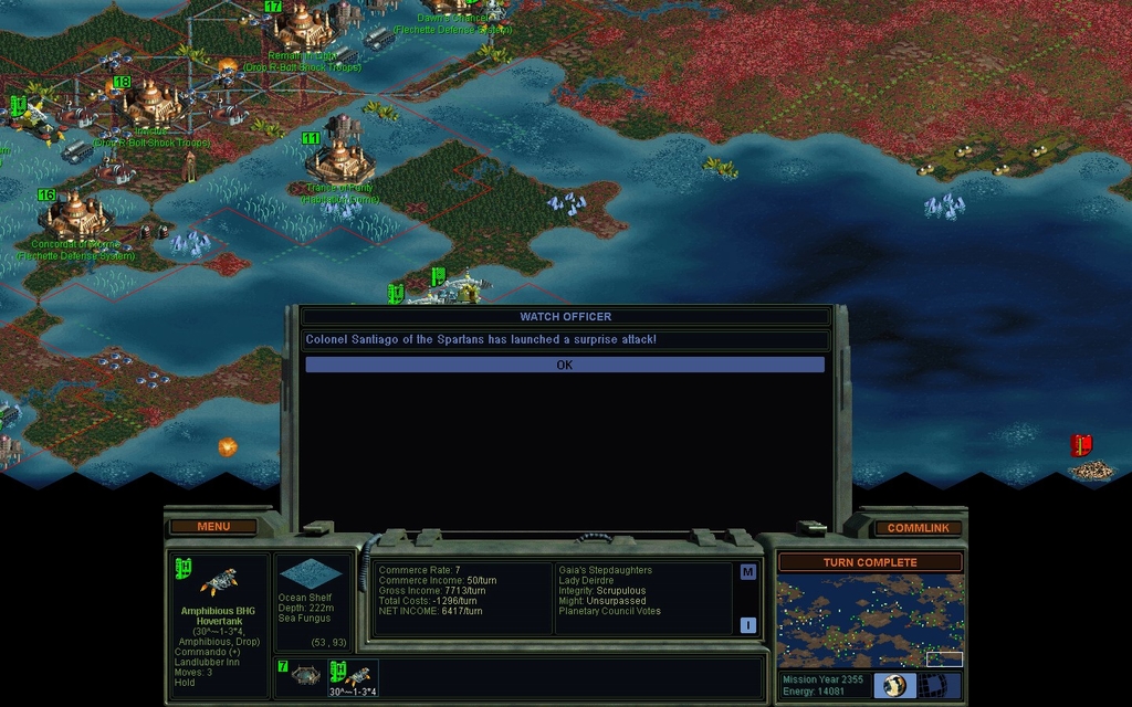 MY 2355.  Having redeployed what probe teams I could find, I take 3 Spartan cities by Total Thought Control.  The 4th eludes me because a screen of troops is in the way.  I take 1 of the troops in preparation for next turn.