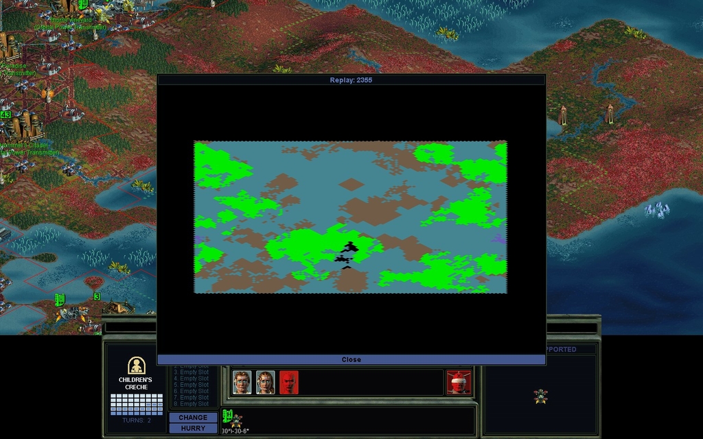 The replay movie was abrupt, with a sudden splotch of green exploding at the end.  The area in the center without green was a Pirate enclave with only sea bases ringing the coast of the continent.