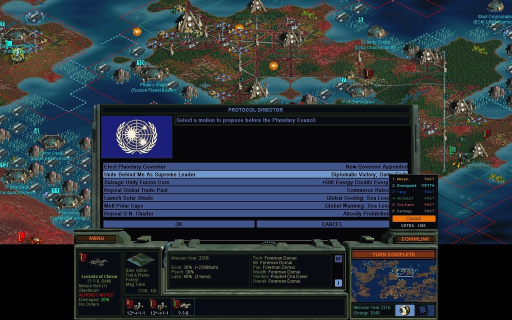 Mission Year 2316.  Oh crap!  I went to check the date for when I can declare Diplomatic Victory.  Looking at my previous screenshot, I noticed something I hadn't before.  If I'm the Governor, I can call the Council every TEN years.  I could have won this game 7 turns ago!  So, without further ado: