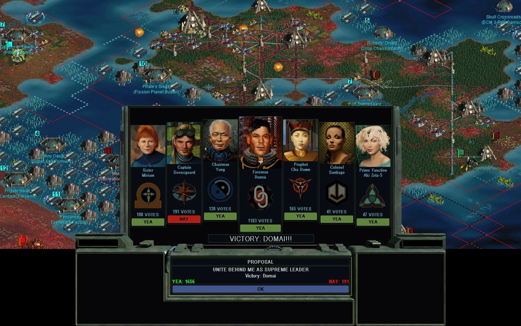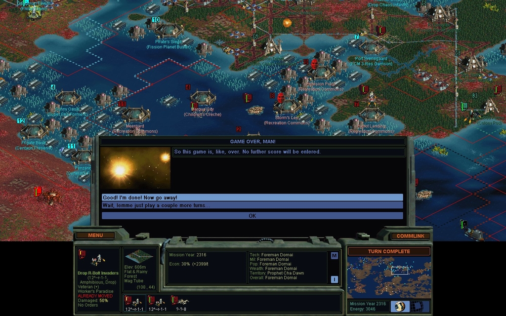 This is the first COMPLETE game I've played of my mod, after 2 person months of full time work on it.  What does this game say about version 1.11?  Are the Drones overpowered, or am I just that good?  There aren't really any "weak" factions anymore, I took care of that.  So I can't just, say, pick Morgan to make life harder on myself.  I should probably play another game with myself as "whatever", let the AI play Domai, and fill out the rest with random opponents.  I expected Santiago to do much better, as she has dominated many test games I've played.  But in this one, she was summarily crushed by the Believers.  She must have gotten a really lousy start right next to them.