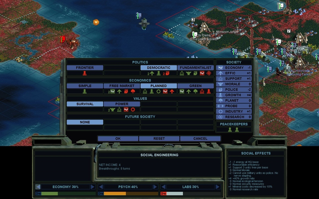 MY 2277.  War averted.  I have a new terraforming tactic for this stage of the game!  Ordinarily by now, I'd have all these forests and food and minerals and mines and stuff.  This time I don't.  So instead of building mines on rocky outcroppings, I'm building Condensers.  When they are near a sufficient number of farms, of course.  This way I can get various bases closer to size 16 without needing Advanced Ecological Engineering.  Which I would have long since had by now, if I hadn't been doing this Planned continual warfare thing.