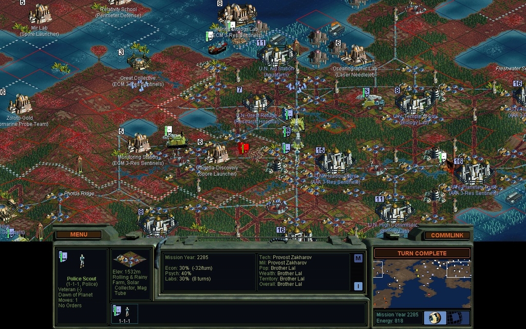A fairly lavender planet I suppose.  Isn't it startling, that one gets the most peaceful time in the game, by committing the most violence?  Just consider what this would have been like, if I hadn't gotten the Planetary Council's blessing on the chemicals.  Well it would have been a lot of dying in agony and getting nukes in the face, that's what.  This was so tame, that I wonder if I'd bother to do it again.  I thought perhaps the mindworms would come, despite the UN agreement.