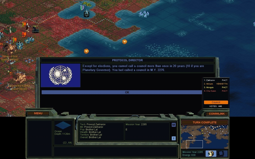 Now to see what Miriam wants to do.  I am only a few votes shy of Supreme Leader.  Those "wet rock" terraforming tactics are actually directly helpful to my cause now.  Zhakarov's population hasn't changed much; he's not into growth the way I am.