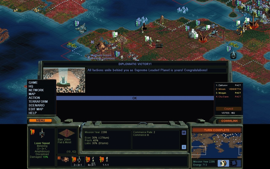 MY 2286.  I'm surprised that Zhakarov voted with me.  Maybe I need to look at the Victory Conditions again and think about joint victories harder.  I could have won this game hours ago!  Admittedly, I would not have stopped until I completely wiped out the Cyborgs with chemicals.  Also in my mod, you have to research Orbital Spaceflight to be capable of Diplomatic Victory.  No peace without nukes!  Although, I never built one.  A good smattering of Conventional Missiles though, which counts as a "big stick" to some degree.