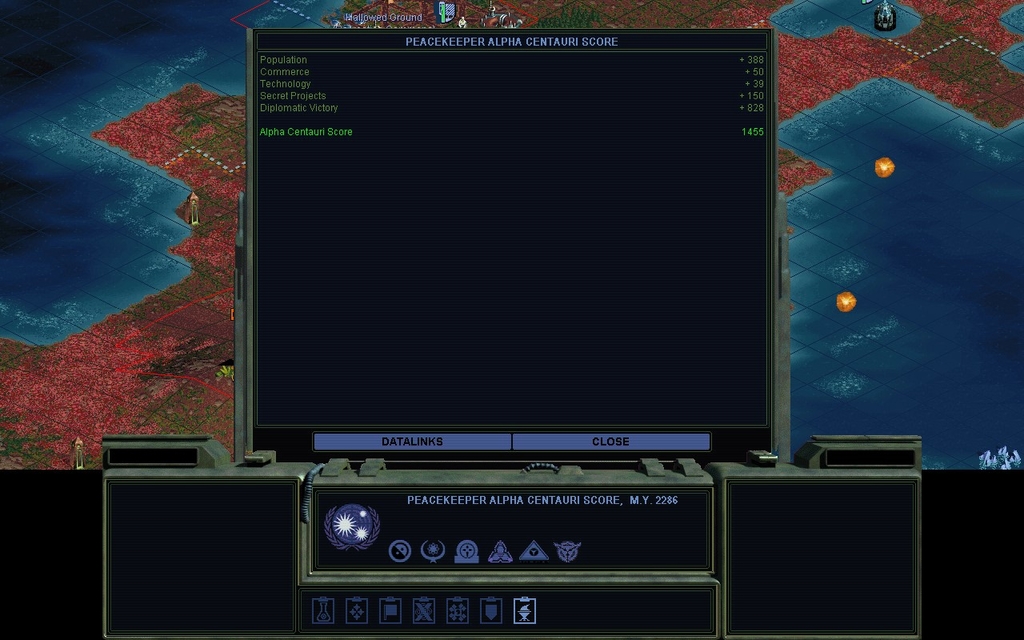 MY 2281.  I didn't have the heart to break my Treaty with the Believers.  Not when I'm so close to a Diplomatic Victory.  I will send a probe team and see if I can have a conversation about our mutual benefit in Victory.  Although, now that there is no obvious enemy other than Cha Dawn, I'm not sure why she'd just agree to let me win the game.  Can I pay her to vote for me for Supreme Leader?