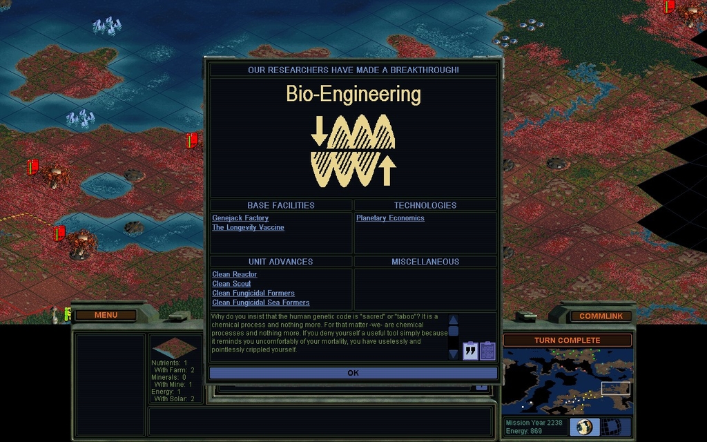 If I can stall out the Ogre I might be ok though. In this version I made C2 Monopole Magnets a prereq for both strength 3 Lasers and strength 3 Plasma armor. I put the Planetary Transit System on it because I didn't have anywhere else to put it. This is probably going to make it more difficult for anyone to trade Laser technology. Plasma technology is already blocked by the Citizens' Defense Force. I will switch to Conquer and see if I can fight Miriam off.