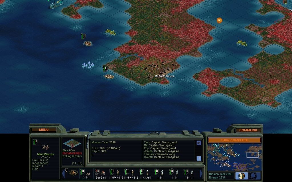 MY 2282.  I get a 5 critter fungal pop.  That city showed 9 eco-damage 2 turns ago.  Then it went to 0 when I rushed a Hybrid Forest in a different city.  This turn it's doing 29 eco-damage, for 34 minerals.  As my Police Scouts aren't useful anymore, I throw them as fodder at the worms.  Not sure why I had a merely Disciplined one of those, but it actually prevailed against a Spore Launcher, despite my -3 PLANET rating.  I need to make sure I've built Command Centers in my cities when making garrison units.  I forgot that I didn't manage to get the Command Nexus.