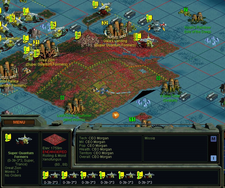 Disappointed that only 1 person has had any comment on anything I've written.  That's not exactly encouragement to keep going, or to believe that there's an audience for the vast amount of work that a writeup like this takes.  Supply and demand, eh?  I definitely have other things I could be doing with Life.  Even if SMAC oriented, I'd sooner play and write up a new game with lessons learned, or try to tweak the AI's play yet again.