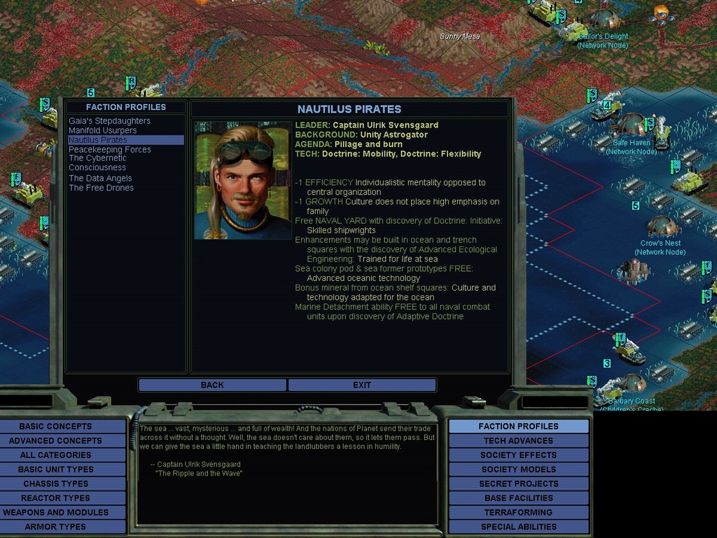 My capitol, Safe Haven, I managed to settle in a lot of shallow water on an energy resource.  Without wasting too many turns to find it.  Port Svensgaard, my 2nd city, I put next to a sea minerals deposit that needed fungus removal.  So it didn't immediately benefit me, and I cannot be said to have been handed a great start on water.  The surrounding land was tasty though, so I used it.  Un-Pirate-like, but in extremes of environment, we have to adapt.