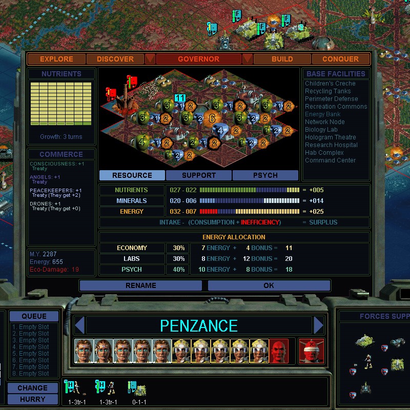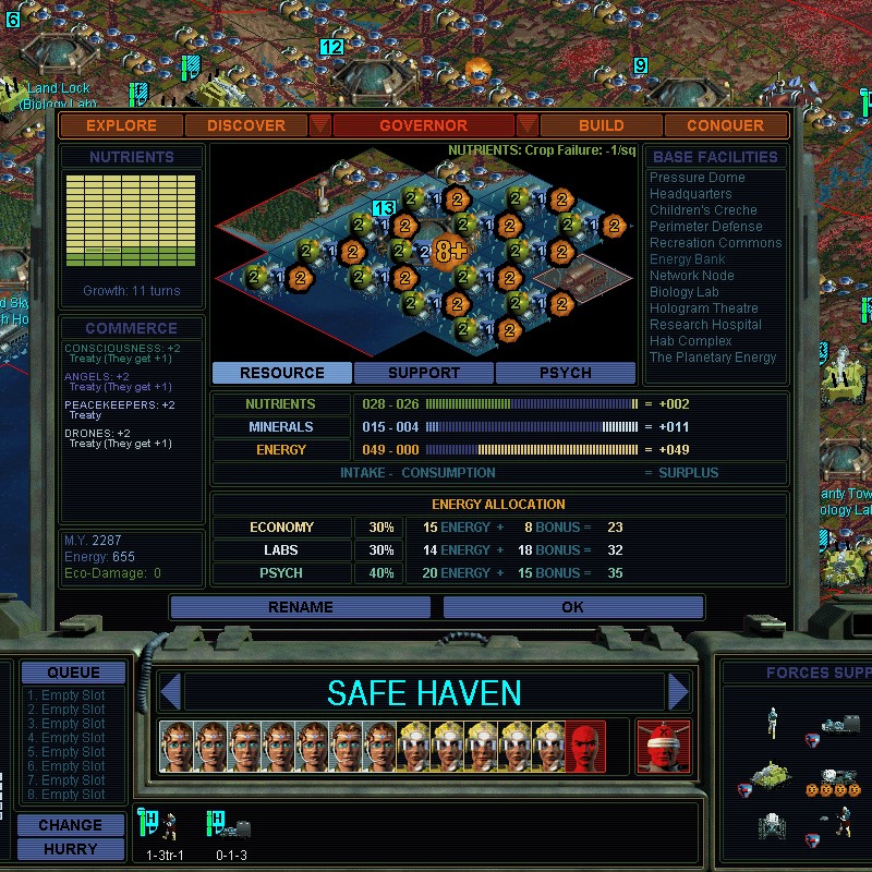 I eventually had enough Formers and Sea Formers working my squares.  I eventually went Democratic, offsetting my -1 Efficiency and -1 Growth faction penalties, to net +1 Efficiency +1 Growth -2 Support.  My budget, I've jacked to 30-40-30 because I don't have the usual SPs to keep people happy.  Somehow I resent the idea of building Hologram Theaters just yet, although it'll surely happen.  I have built Children's Creches for efficiency and growth.  Now everyone is working on Network Nodes, for lack of better to do.
